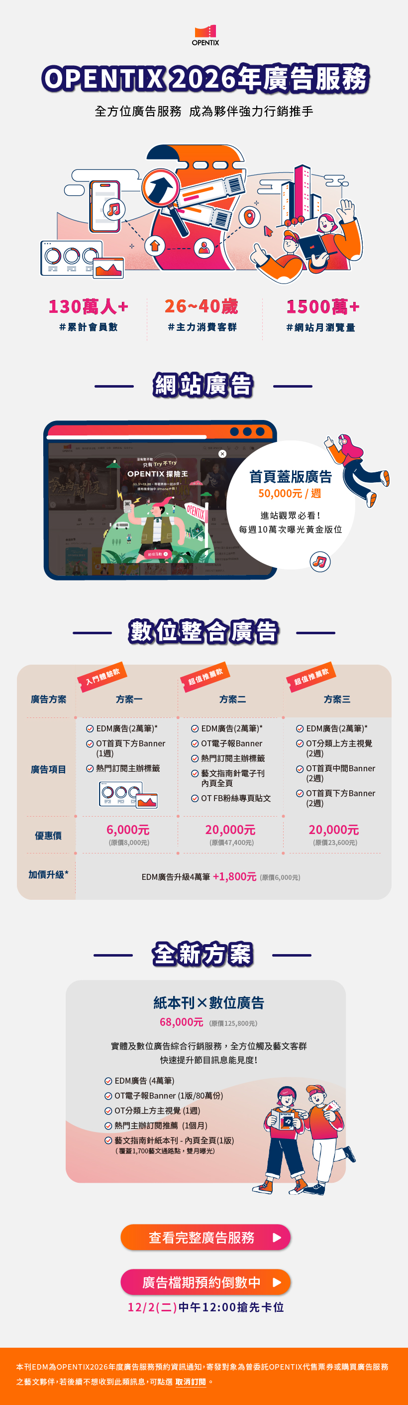 本專案通知派發予曾委託OPENTIX代售票券或購買廣告服務之夥伴,若後續不需收到活動訊息,請點選